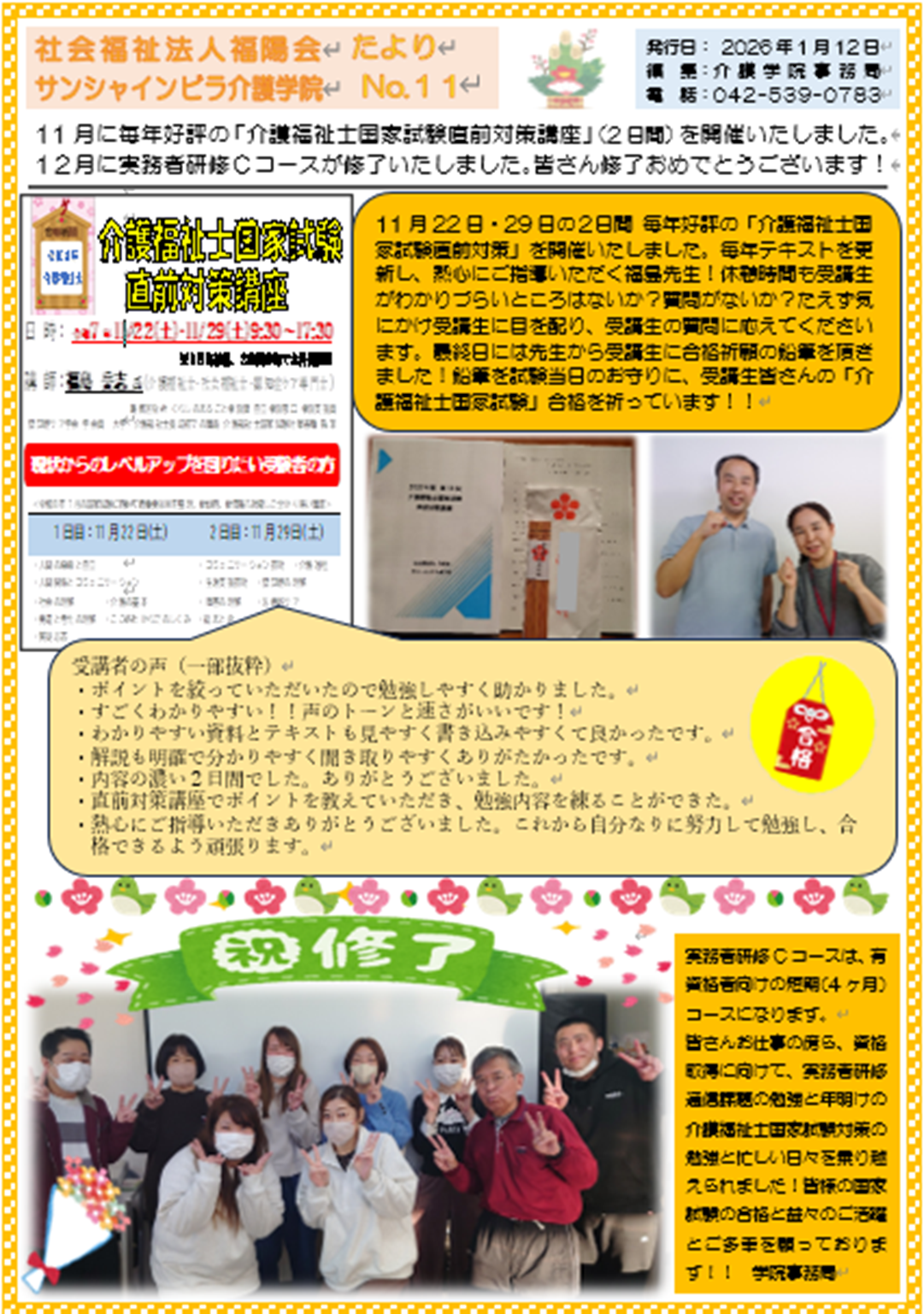2025年度 11月「介護福祉士国家試験直前対策講座」の開催と12月実務者研修Dコース修了に伴い、学院たよりvol.11を発行致しました。ぜひご覧ください。